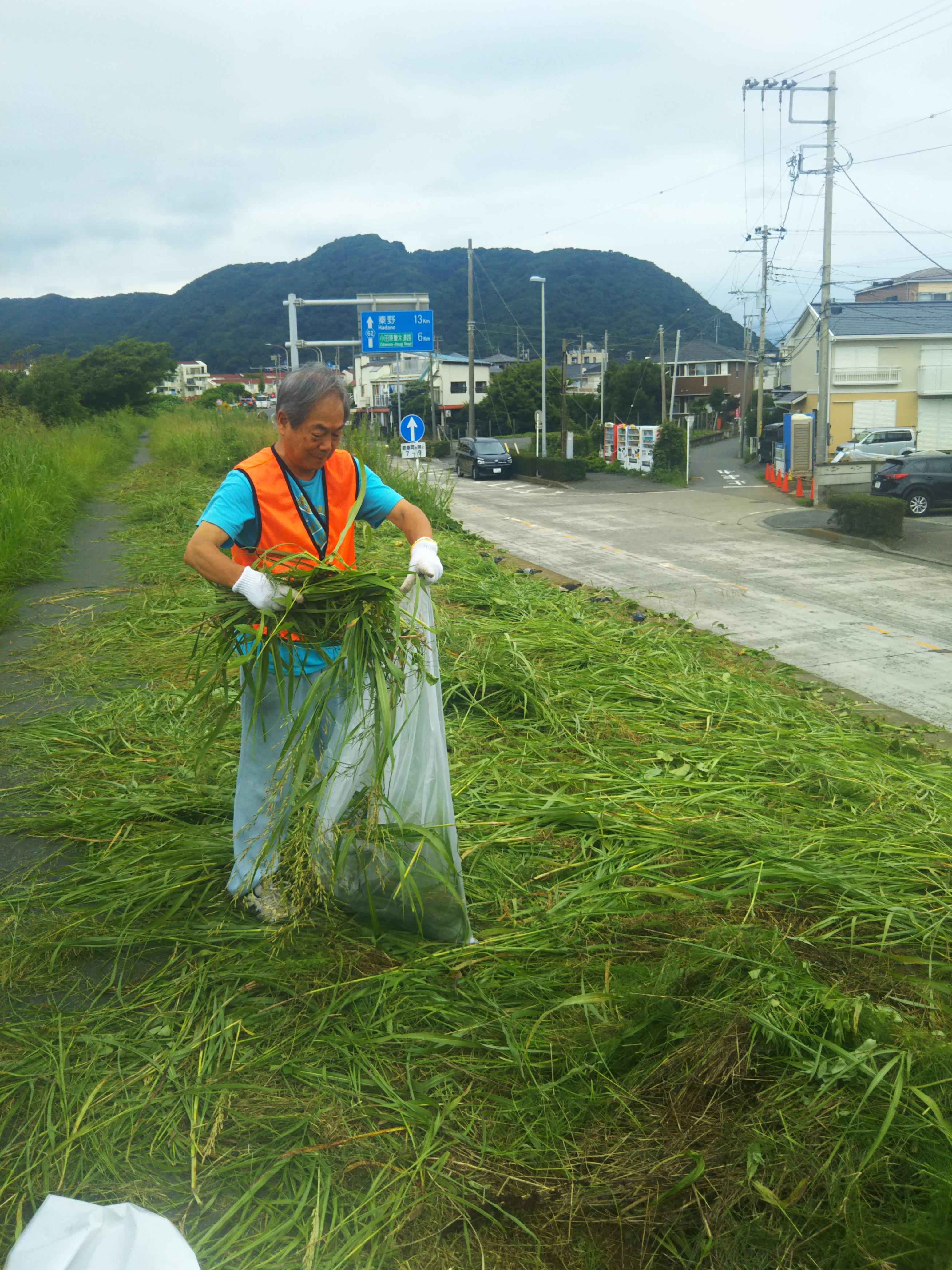 8月の残暑がまだ厳しい時期ですが、花水川土手の草刈りに参加しました。先月実施の際は参加できず、参加されたボランティアの方も2名と少数で行い大変な作業だったとお聞きしました。